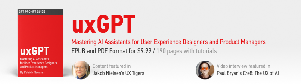 "This book offers practical insights for UX professionals eager to leverage AI to elevate user research and design. This guide presents time-saving techniques you can apply to seamlessly integrate AI into your UX practice. And yes, I used ChatGPT to fine-tune this blurb—thanks to Patrick, I knew exactly how to get the best results."